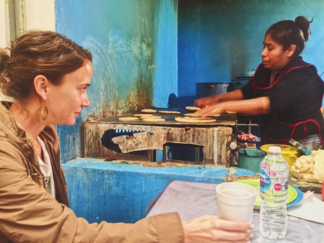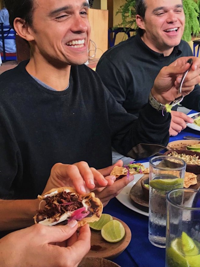 Our “veganish” diet was happily compromised in Mexico, which with its rich culinary history and delicious ingredients, really deserves to be grabbed by the taco horns. Below, Hermanos Gerchow are shown barely enjoying their orders of chapulines (grasshopper) and escamoles (ant larvae). Conner quietly crafts her next chapulín taco, bottom left in the picture.