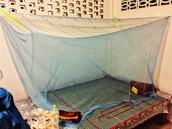 Conner took the picture below at 4AM on the day before the retreat started, when we still had our cell phones. The concrete slab bed & reed matting combination is a plush 6,800 on Sleep Numbers’ 0-100 scale, and the wooden block (which she affectionately named “Woody”) in the lower left corner doubles as both a pillow and mosquito-net weight. This is the height of monastic luxury and comfort.